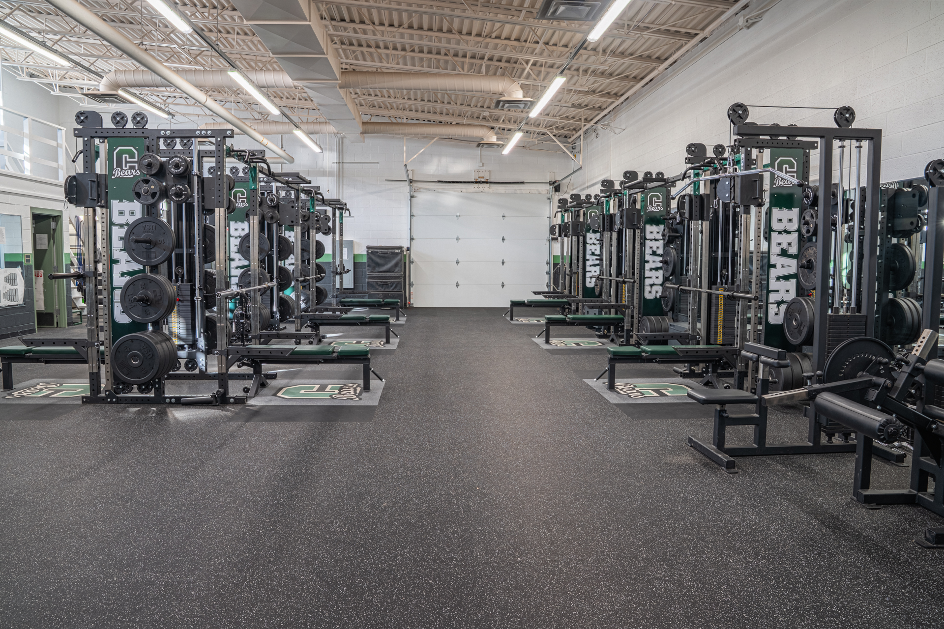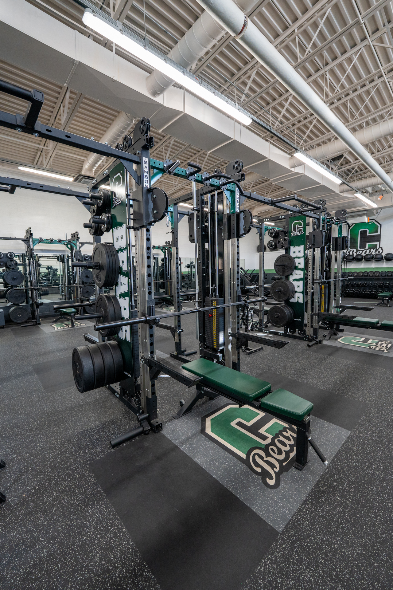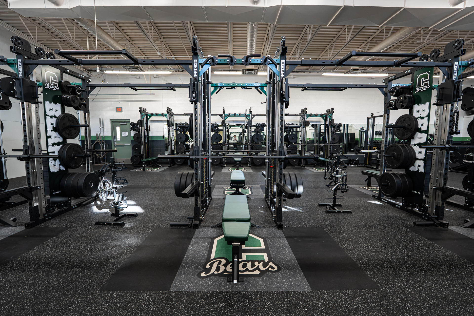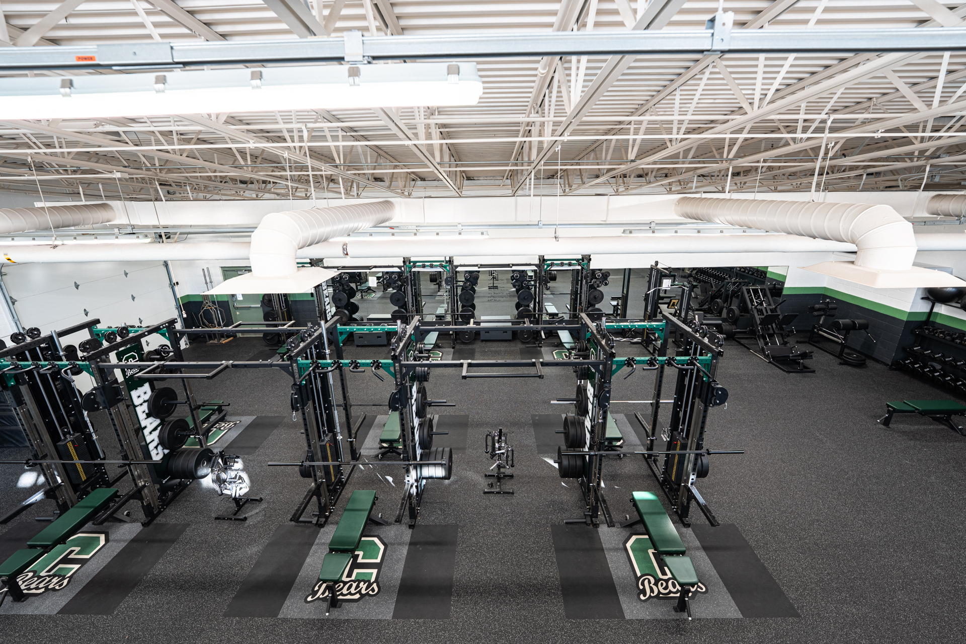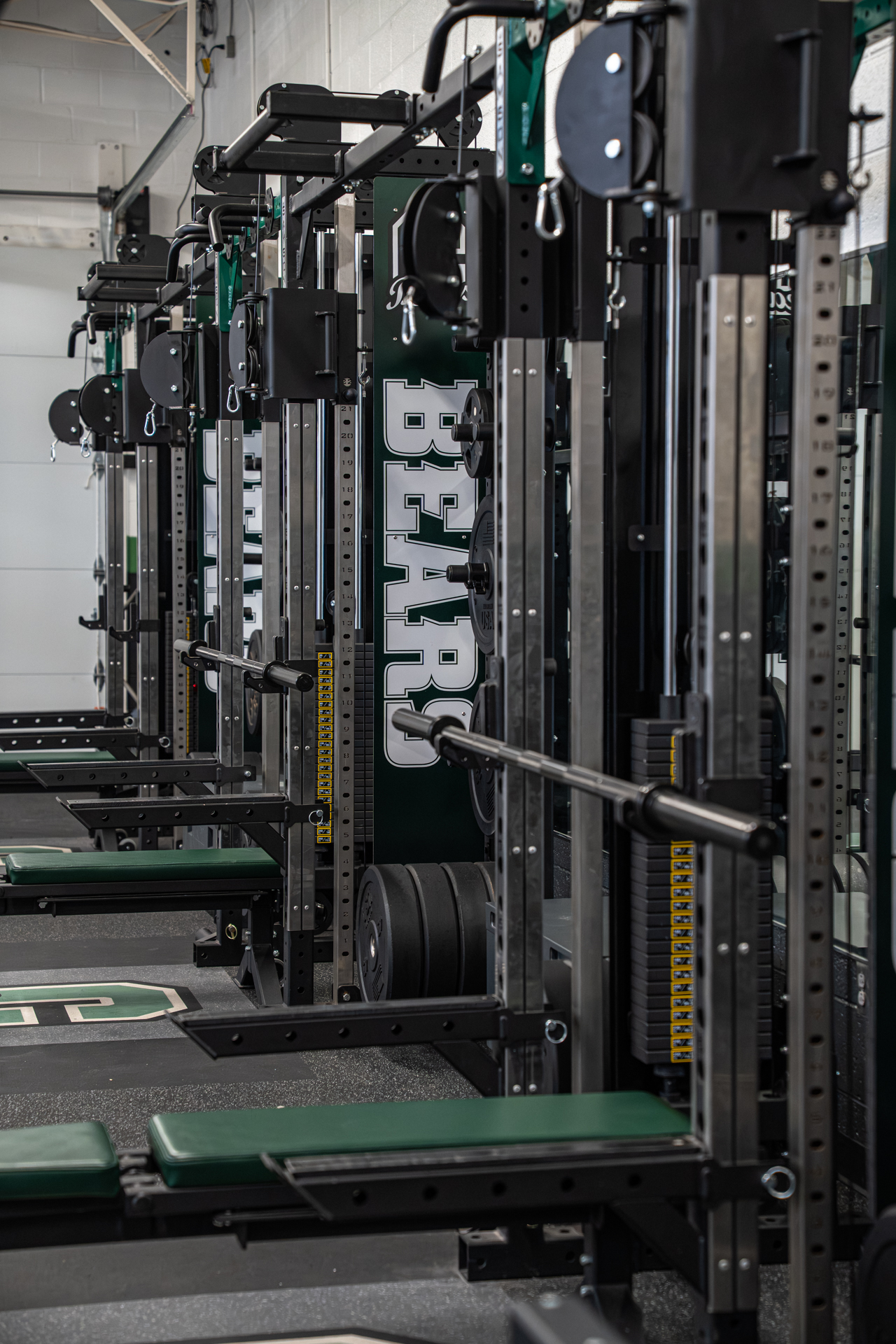 The new facility addressed every deficiency in the old one. Concrete floors replaced with commercial-grade athletic flooring. Fully ADA compliant. Stainless steel hardware, Kelly green custom color accents, and branded weight racks that tie the entire room together. “When you walk in, it’s very eye-catching. Organized, great stainless steel, beautiful Kelly green colors. Whenever you walk in here, it’s exciting.”